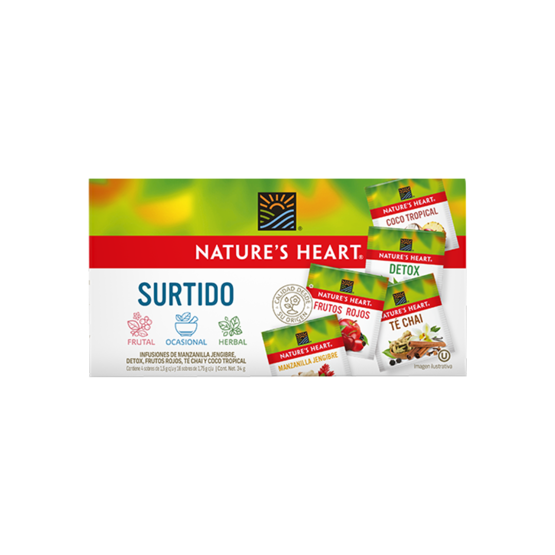 Variedad de tés clásicos (ej. Durazno Jamaica, Coco Tropical, Frutos Rojos, Chai, Detox, Relax).