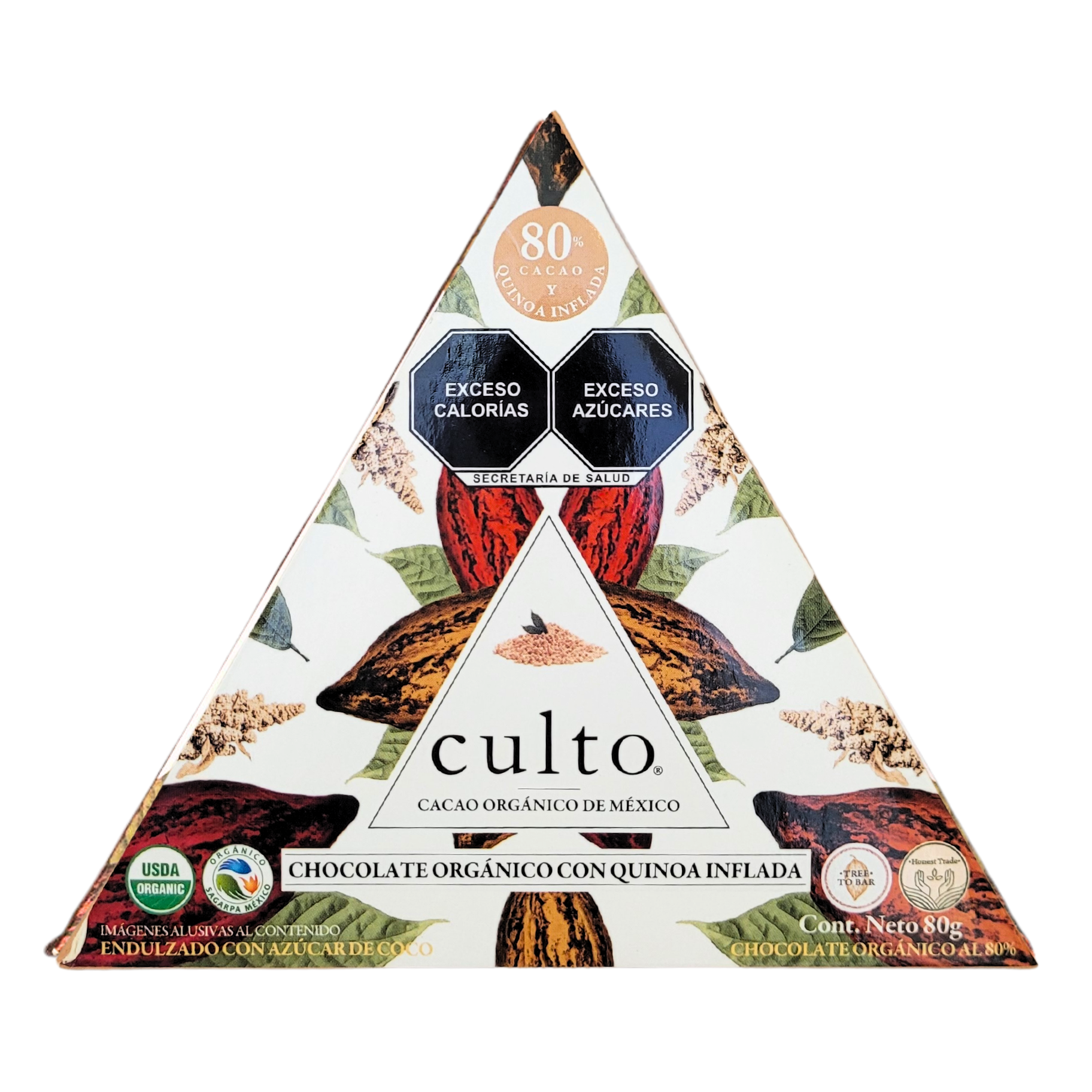 Chocolate orgánico al 80%, quinoa inflada, azúcar de coco orgánica, manteca de cacao.