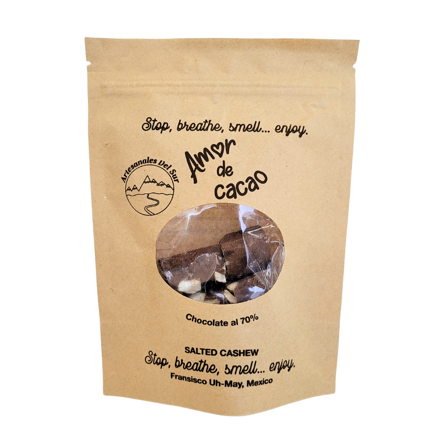 Pasta de cacao, azúcar de caña orgánica, manteca de cacao, nueces de la India.